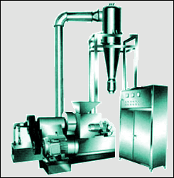 该机组由一台粉碎主机、旋风分离器、电控柜和给水机构四大部件组成。管道旋风分离器与主机于一体,所用电器集用电控柜内,给水机构可控制整体的冷却,是物料在常温下工作。主机由机架、送料机构、电机、送料机构、一副平面(或锥型)定磨盘和动磨盘。在粉碎室通过剪切、研磨达到粉碎之目的,这样在常温下,确保被粉碎物料的质量,再通过风机风力作用将成品粉剂,经管道送入旋风分离器,进入储物袋。